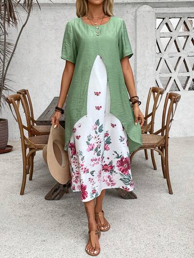 Women's Summer Short Sleeve Casual Flower Print 2 In 1 Dress-23%