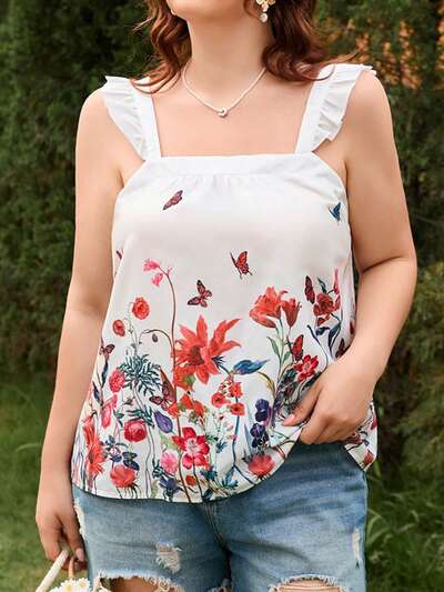 Butterfly & Floral Printed Flutter Sleeve, A-Line, Romantic Casual & Holiday Style Plus Size Women Tops-40%