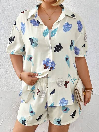 Plus Size Butterfly And Plant Printed Short Sleeve Shirt And Shorts Set