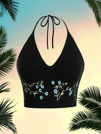 Plus Size Summer Casual Sleeveless Sweater Vest With Embroidery And Backless Design