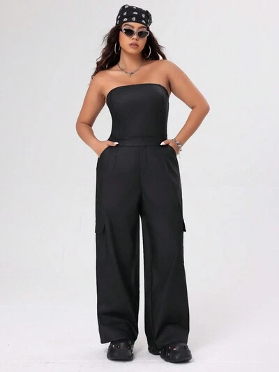 Plus Size Solid Color Straight Leg Tube Jumpsuit With Diagonal Pocket