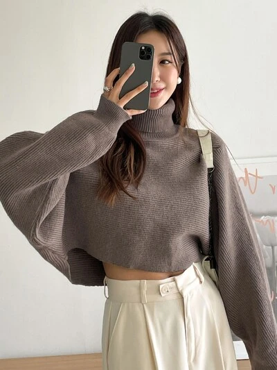 Turtleneck Batwing Sleeve Crop Sweater,Long Sleeve Tops,Fall Women Clothes-60%