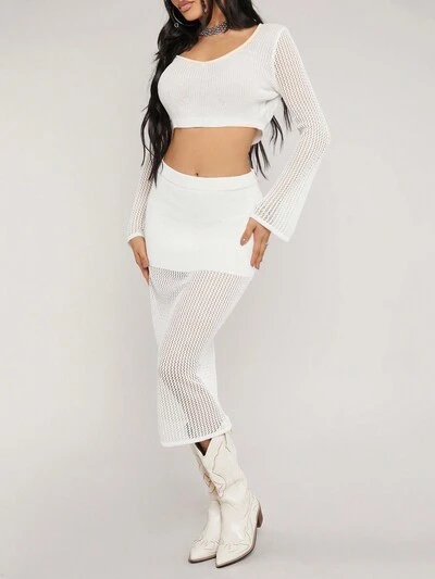 Ladies' Casual Hollow Out Long Sleeve Crop Top And Knit Skirt Set-35%