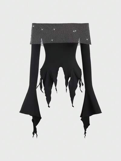 Women's Rhinestone Decor Off Shoulder Bell Sleeve Asymmetric Hem T-Shirt-32%