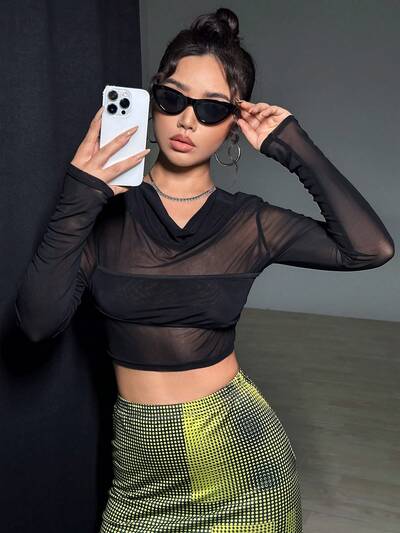 Contrast Cut Out Twist Glitter Long Sleeves Crop Sexy Top-65%