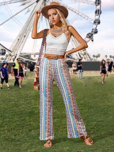 Solid Color Lace Splicing Camisole Top & Vintage Printed Flared Pants Set