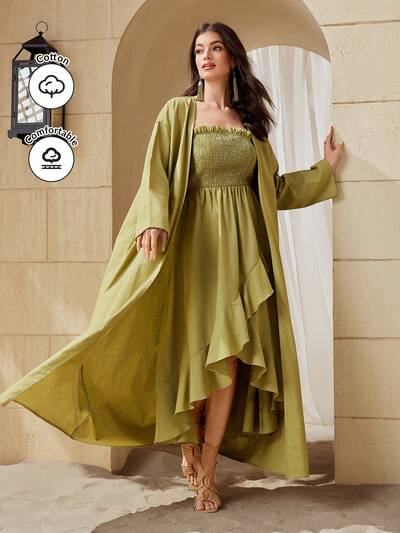 Women's Drop Shoulder Coat And Wrapped Bust Shirred Dress Two Pieces Set 2 Pieces Set-60%