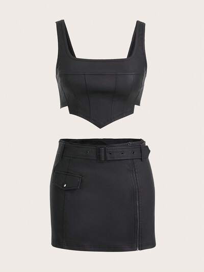 Asymmetrical Hem PU Leather Tank Top & Belted Skirt-27%