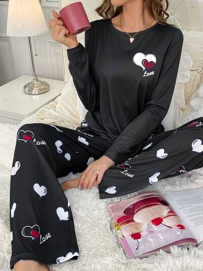 Heart And Letter Print Long Sleeve Pajama Set, Fall Winter Clothes-18%