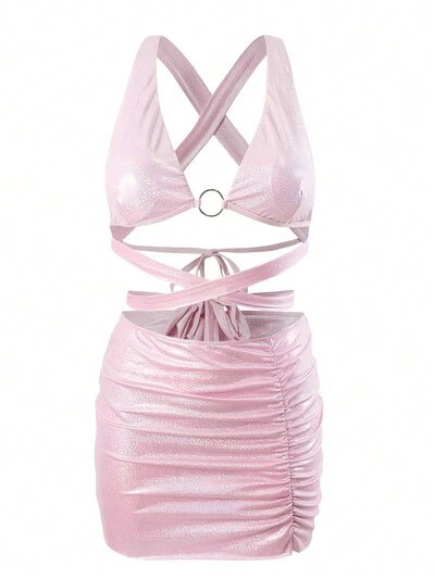 Metallic Fabric Halter Neck Two-Piece Bikini Set For Women Summer Beach-32%