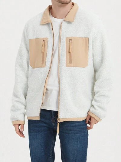 Men Contrast Panel Zip Up Teddy Outdoor Jacket-65%