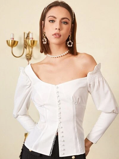 Button Up Shirred Ruffle Trim Blouse