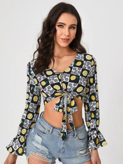 Plaid & Lemon Print Tie Front Crop Blouse