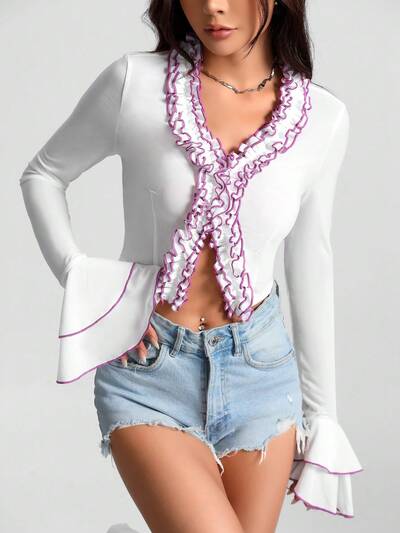 Lace Up Front Frill Trim Flounce Sleeve Bandana Hem Crop Blouse Fall Cloth For Women-32%