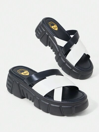 Women's Indoor Round Toe Fashionable Simple Wedge Heel Thick Bottom Slippers In Solid Black-14%