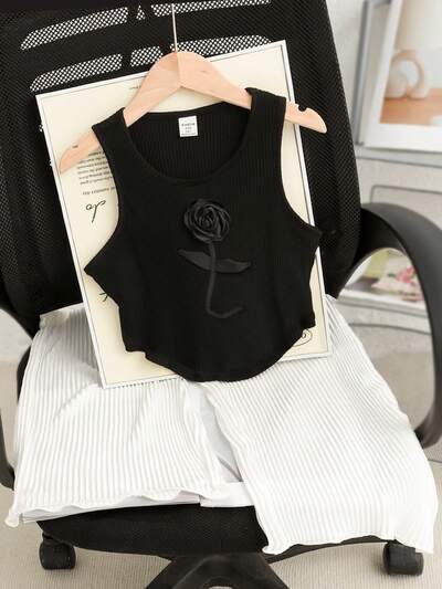 Tween Girl 2pcs Rose Printed Sleeveless Top And Solid Color Pants Set-65%
