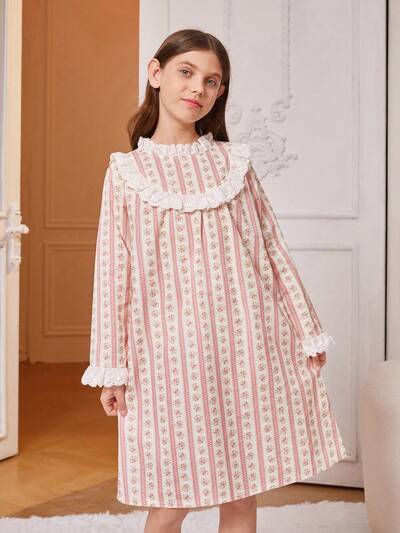 1pc Tween Girls' Striped Floral & Lace Trim Long Sleeve Homewear Sleep Dress-44%