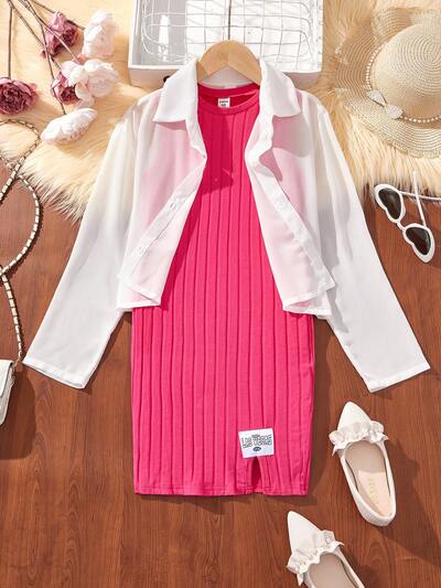 2pcs/Set Tween Girls' Knitted Solid Color Round Neck Sleeveless Loose Casual Dress And Woven Solid Color Chiffon Casual Shirt-44%