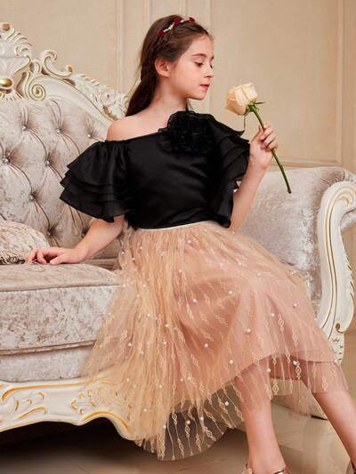 2pcs/Set Tween Girls' Cute Asymmetrical Layered Organza Ruffle Hem Top & Beaded Mesh Skirt-45%