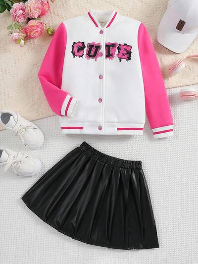 Tween Girl Letter Graphic Striped Trim Jacket & PU Skirt-60%
