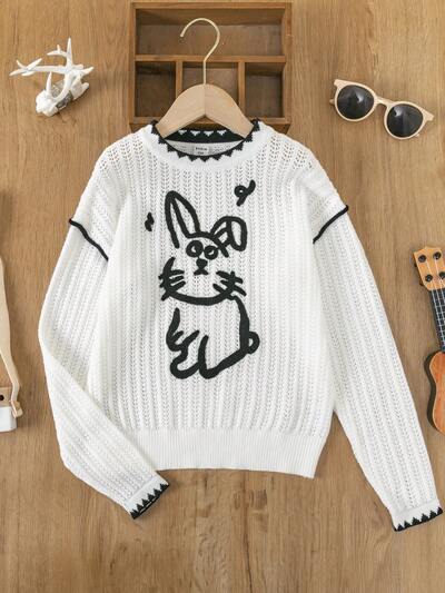 Tween Girl Rabbit Pattern Contrast Trim Drop Shoulder Sweater-60%