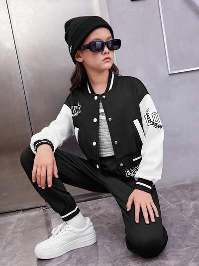 Tween Girl 1pc Letter Graphic Two Tone Varsity Jacket & 1pc Sweatpants-60%