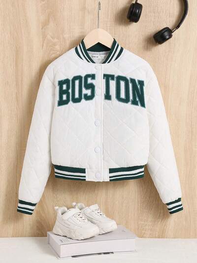 Tween Girl Letter Patched Striped Trim Quilted Varsity Jacket-60%