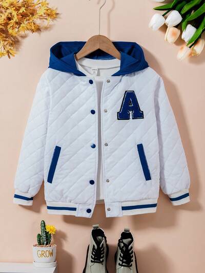 Tween Girl Letter Patched Striped Trim Drop Shoulder Hooded Quilted Varsity Jacket-47%