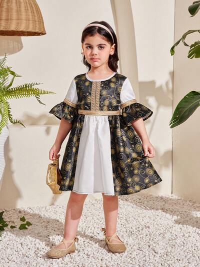 Young Girl Casual Round Neck Dress With Color Blocking, Weave Tape Decoration And Hot Stamping Pattern-46%
