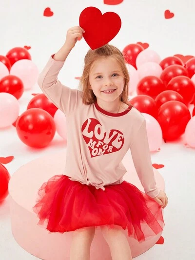 Little Girls' Pink Long Sleeve T-shirt With Slogan Print And Knot Detail Hem-65%
