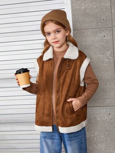 Tween Girl 1pc Zip Up Faux Suede Vest Coat-60%
