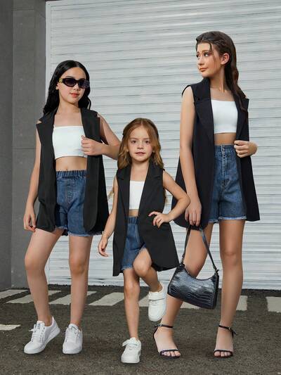 Teen Girl Summer Solid Color Lapel Sleeveless Jacket And Shorts Casual Two-Piece Set-60%