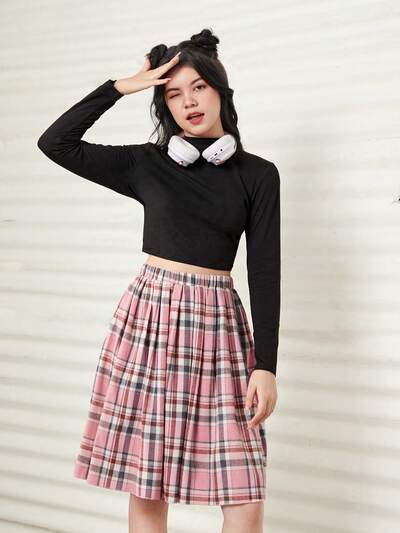 Teen Girls' Elegant Casual High Neck Crop Top & Plaid Mini Skirt Two Pieces Set-65%