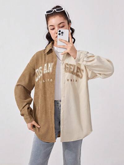Teen Girl Letter Graphic Two Tone Drop Shoulder Corduroy Shirt