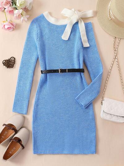 Teen Girl Tie Shoulder Contrast Trim Sweater Dress-60%