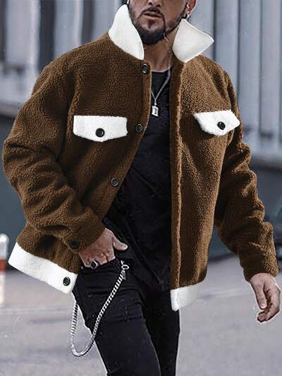 1pc Men's Loose Fit Color Block Teddy Lined Padded Coat With Flap Pockets And Zipper Closure-60%