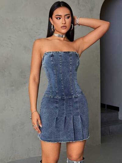 1pc Cut Out Tube Bodycon Denim Dress-36%