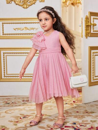 Young Girls' Summer Gradient Color Lace & Pleated Floral Applique Midi Dress-60%