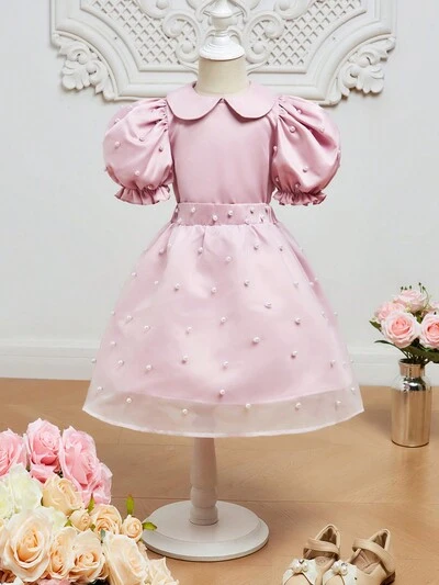 Tween Girls' Cute Peter Pan Collar Bubble Sleeve Blouse And Skirt Set-44%