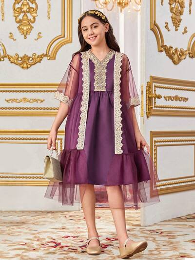 Tween Girl Loose Cute Contrast Color Embroidered Mesh Jacket With Applique & V-Neck Dress Two Pieces Set-65%