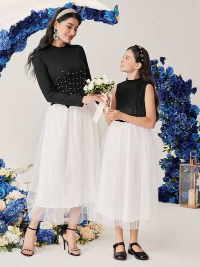 Tween Girls' Waist Rhinestone Decor Mesh Party Dress