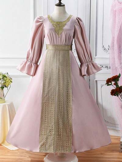 Tween Girls' Loose Fit Long Outerwear Dress With Flare Sleeve & Lace Embellishment Two Pieces Set-48%