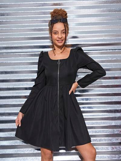 Teen Girls' Solid Color Square Neck Zippered Long Sleeve Dress-65%