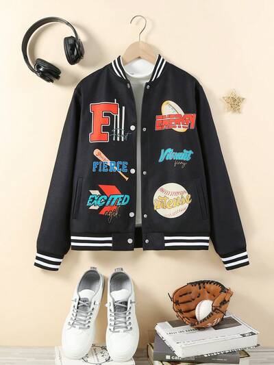 1pc Teen Girls' Thick Woolen Jacket With Baseball Collar And Letter Pattern For Autumn And Winter-60%