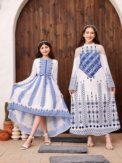 Tween Girls' Cute And Conservative Holiday Round Neck Long Sleeve Midi Dress-45%