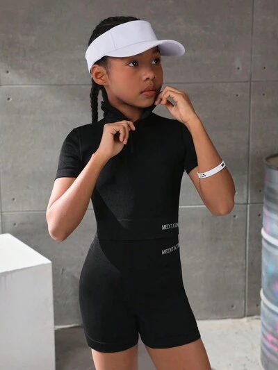 Tween Girls' Seamless Letter Jacquard Half-Zip T-Shirt And Shorts Sports 2pcs/Set-43%