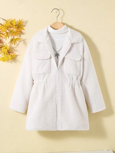 Tween Girl 1pc Flap Pocket Drop Shoulder Teddy Coat-60%