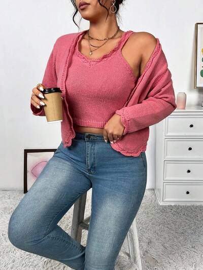 Women's Plus Size Solid Color Shell Hem Tank Top And Cardigan Sweater Set-60%