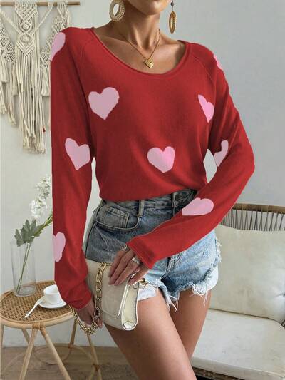 Women's Heart Pattern Raglan Sleeve Sweater, Knit Pullover Fall Winter-65%