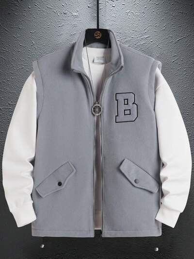 Loose Fit Men's Sleeveless Vest Jacket With Letter Applique & Zipper Closure, Tee Not Included